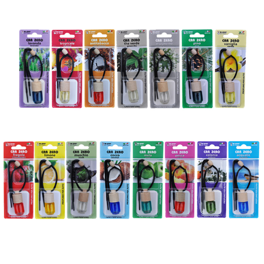 Ambientadores de essências perfumadas, com diferentes fragâncias: lavanda, tropical, antitabaco, chá verde, lírio do vale, pinho, baunilha, morango, limão, almíscar branco, coco, maçã, pêssego, colônia, aquático.